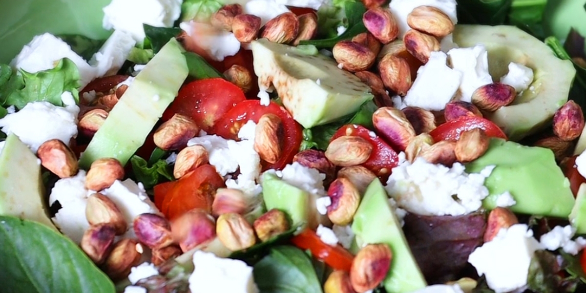 The combination of avocado, tomato, basil, and pistachios makes this salad an ideal appetizer for parties or even a light and healthy meal.
